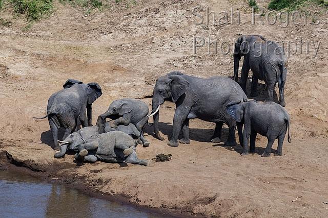 African elephant herd resting by a river (Loxodonta africana). Maasai Mara National Reserve, Kenya. July 2015.