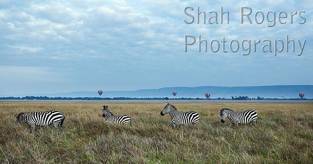 Common or Plains Zebra herd with tourist hot-air balloons in the background (Equus quagga burchellii). Maasai Mara National Reserve, Kenya. July 2015.