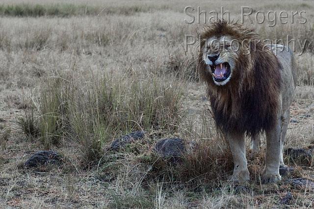 Lion male using Flemen to scent a female (Panthera leo). Maasai Mara National Reserve, Kenya. July 2015.
