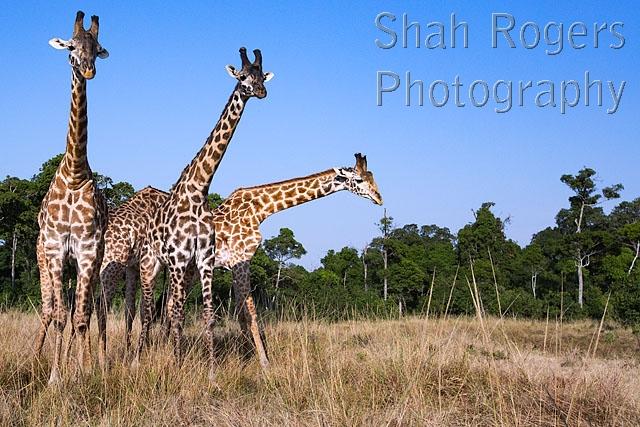 Maasai giraffe herd gathered together (Giraffa camelopardalis tippelskirchi). Maasai Mara National Reserve, Kenya. July 2015.