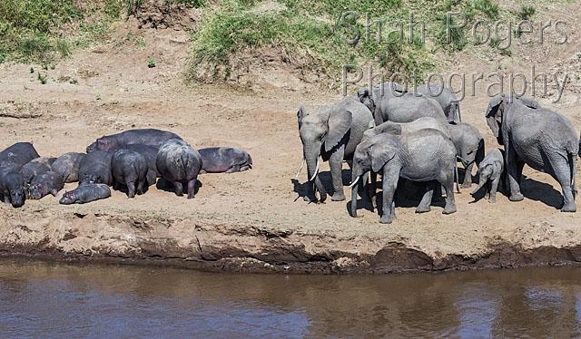African elephant herd (Loxodonta africana) and Hippopotamus pod (Hippopotamus amphibius) resting by the Mara River. Maasai Mara National Reserve, Kenya. July 2015.