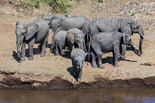 African elephant herd (Loxodonta africana) resting by the Mara River. Maasai Mara National Reserve, Kenya. July 2015.