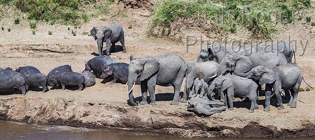 African elephant herd (Loxodonta africana) and Hippopotamus pod (Hippopotamus amphibius) resting by the Mara River. Maasai Mara National Reserve, Kenya. July 2015.