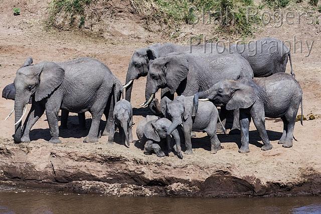 African elephant herd (Loxodonta africana) resting by the Mara River. Maasai Mara National Reserve, Kenya. July 2015.