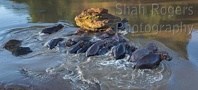 Hippopotamus group in the Mara River (Hippopotamus amphibius). Maasai Mara National Reserve, Kenya. November 2016.