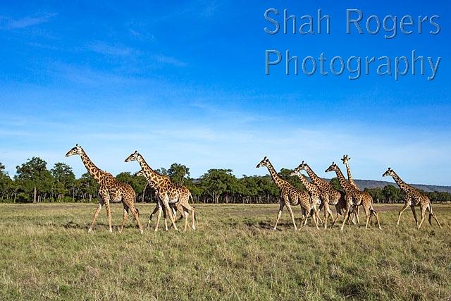 Maasai giraffe herd on the move (Giraffa camelopardalis tippelskirchi). Maasai Mara National Reserve, Kenya. November 2016.