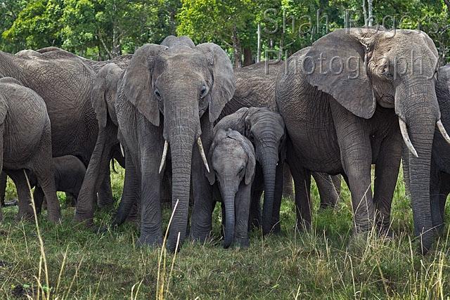 African elephants protecting their young by surrounding them (Loxodonta africana). Maasai Mara National Reserve, Kenya. December 2016.