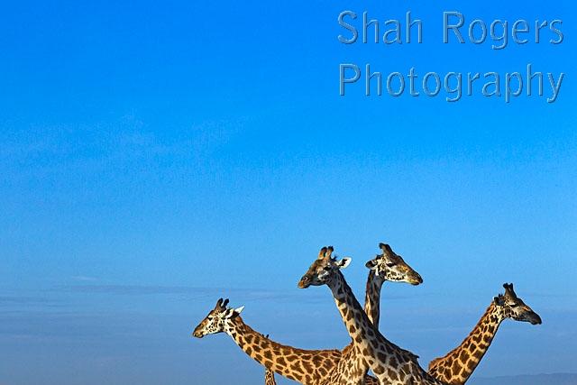Maasai giraffe herd gathered together (Giraffa camelopardalis tippelskirchi). Maasai Mara National Reserve, Kenya. December 2016.