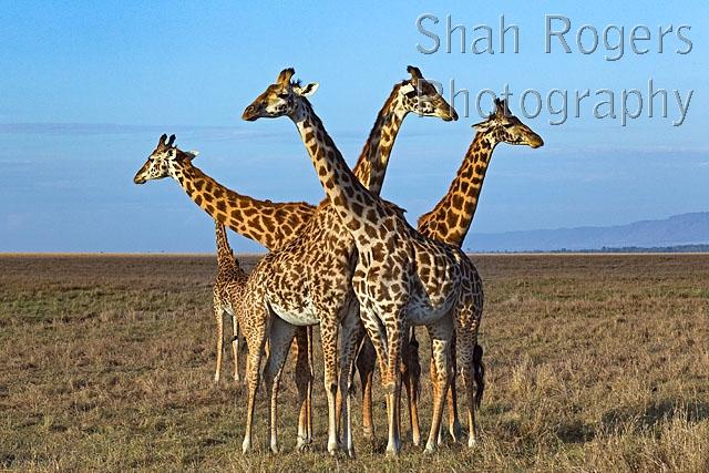 Maasai giraffe herd gathered together (Giraffa camelopardalis tippelskirchi). Maasai Mara National Reserve, Kenya. December 2016.