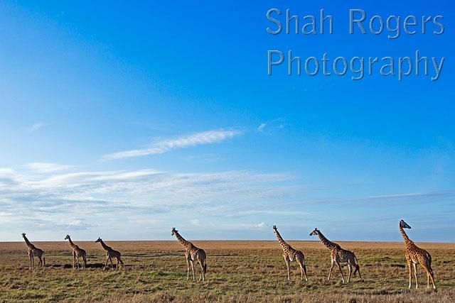 Maasai giraffe herd on the move (Giraffa camelopardalis tippelskirchi). Maasai Mara National Reserve, Kenya. December 2016.