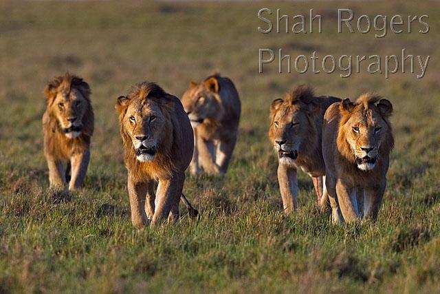 Lion males walking together (Panthera leo). Maasai Mara National Reserve, Kenya. July 2017.