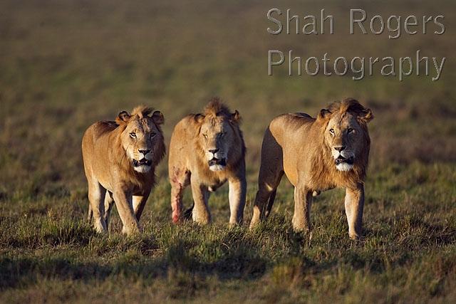 Lion males walking together (Panthera leo). Maasai Mara National Reserve, Kenya. July 2017.