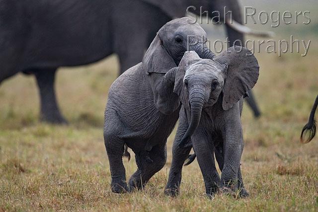 African elephant babies playing (Loxodonta africana). Maasai Mara National Reserve, Kenya. July 2017.