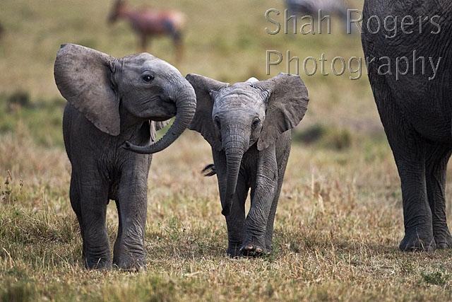 African elephant babies playing (Loxodonta africana). Maasai Mara National Reserve, Kenya. July 2017.
