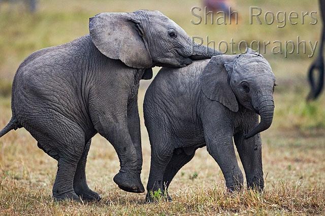 African elephant babies playing (Loxodonta africana). Maasai Mara National Reserve, Kenya. July 2017.