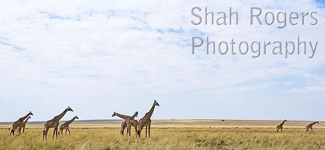Maasai giraffe herd on the grass plains (Giraffa camelopardalis tippelskirchi). Maasai Mara National Reserve, Kenya. August 2017.