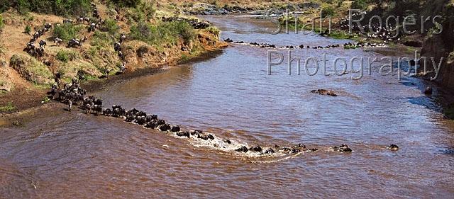 Eastern White-bearded Wildebeest crossing the Mara River (Connochaetes taurinus). Maasai Mara National Reserve, Kenya. August 2017.