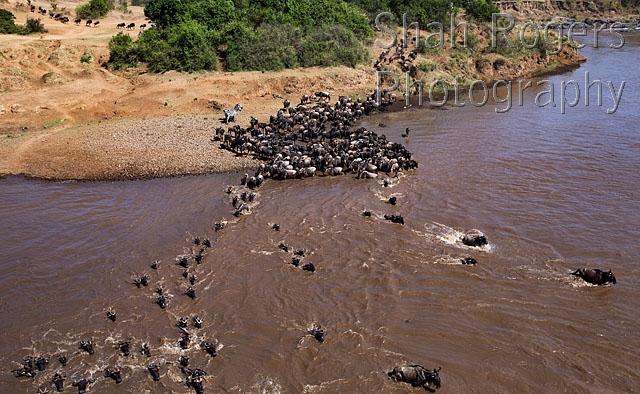 Eastern White-bearded Wildebeest crossing the Mara River (Connochaetes taurinus). Maasai Mara National Reserve, Kenya. August 2017.