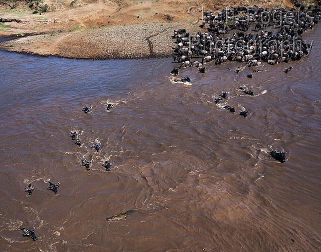 Eastern White-bearded Wildebeest crossing the Mara River (Connochaetes taurinus). Maasai Mara National Reserve, Kenya. August 2017.
