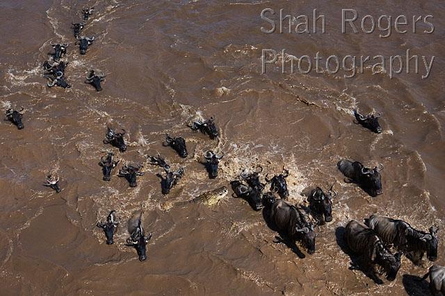 Eastern White-bearded Wildebeest crossing the Mara River (Connochaetes taurinus). Maasai Mara National Reserve, Kenya. August 2017.