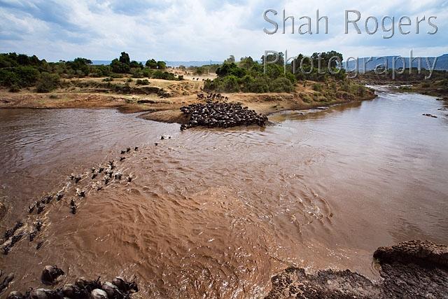 Eastern White-bearded Wildebeest crossing the Mara River (Connochaetes taurinus). Maasai Mara National Reserve, Kenya. August 2017.