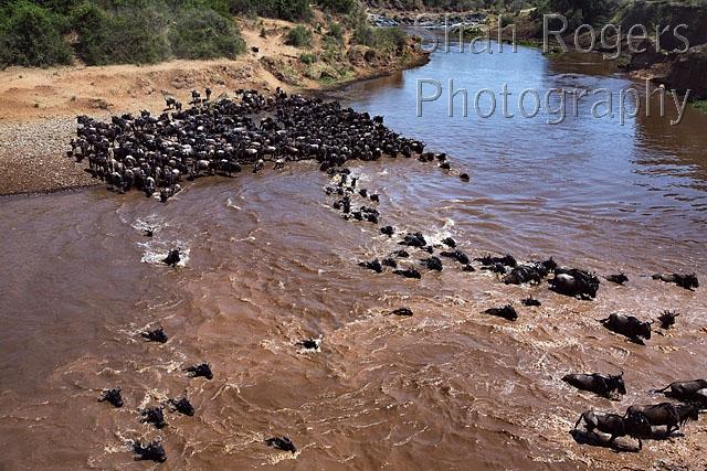 Eastern White-bearded Wildebeest crossing the Mara River (Connochaetes taurinus). Maasai Mara National Reserve, Kenya. August 2017.