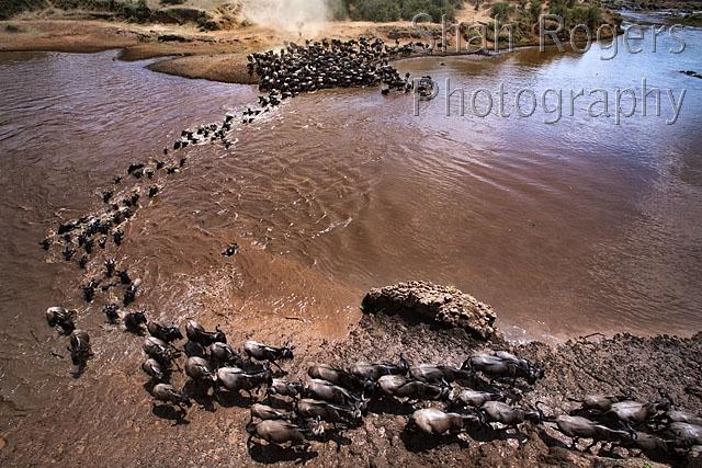 Eastern White-bearded Wildebeest crossing the Mara River (Connochaetes taurinus). Maasai Mara National Reserve, Kenya. August 2017.