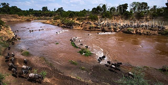 Eastern White-bearded Wildebeest crossing the Mara River (Connochaetes taurinus). Maasai Mara National Reserve, Kenya. August 2017.