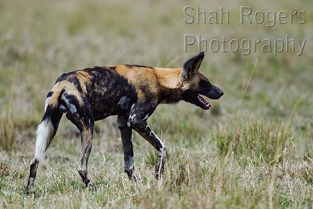 African wild dog walking (Lycaon pictus). Maasai Mara National Reserve, Kenya. August 2017.