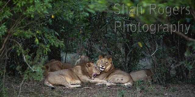 Lion males resting and grooming (Panthera leo). Maasai Mara National Reserve, Kenya. August 2017.