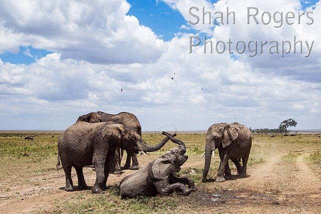 African elephant herd wallowing in mud (Loxodonta africana). Maasai Mara National Reserve, Kenya. August 2017.