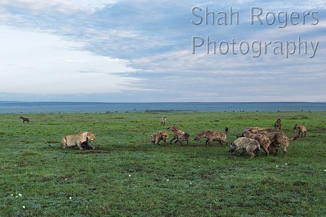 Lioness on a kill (Panthera leo) watched by Spotted hyena (Crocuta crocuta). Maasai Mara National Reserve, Kenya. November 2017.
