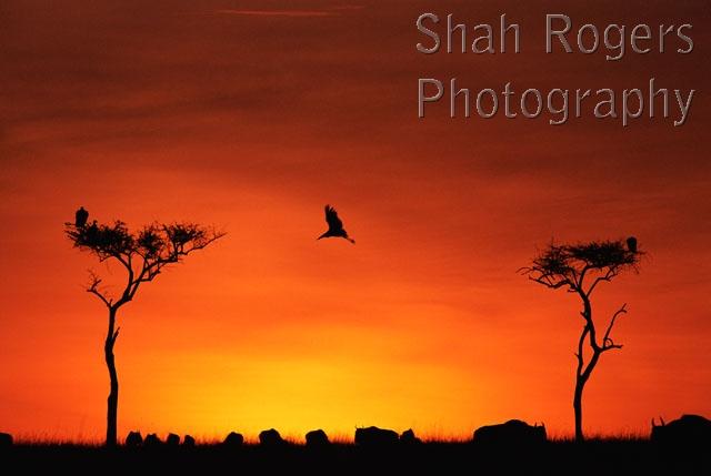 Marabou stork flying between trees at sunrise with Wildebeest below(Connochaetes taurinus). Maasai Mara National Reserve, Kenya