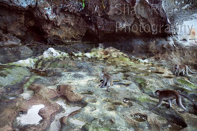 Long-tailed or crab-eating macaques foraging in pools left in a cove at low tide with sandstone cliffs in the background - wide angle perspective (Macaca fascicularis). Bako National Park, Sarawak, Borneo, Malaysia. Apr 2010. |