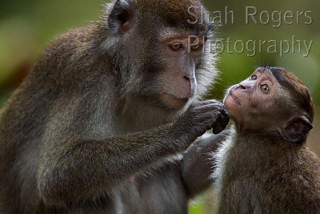 Long-tailed or crab-eating macaque adult female grooming a juvenile aged 12-18 months (Macaca fascicularis). Bako National Park, Sarawak, Borneo, Malaysia. Mar 2010. |