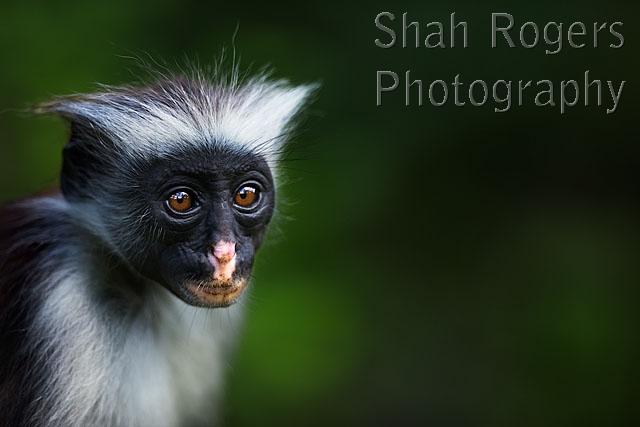 Zanzibar Red Colobus or Kirk's Red Colobus infant portrait (Piliocolobus kirkii or Procolobus kirkii). Jozani-Chwaka Bay National Park, Zanzibar, Tanzania. May 2017.