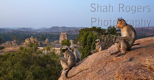 Southern Plains Grey Langurs or Hanuman Langurs (Semnopithecus dussumieri) and a Bonnet macaque male (Macaca radiata) sitting on rocks overlooking ruined temples. Hampi, Karnataka, India. January 2018.