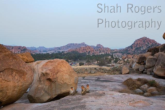 Bonnet Macaques sitting on granite rock (Macaca radiata). Hampi, Karnataka, India. January 2018.