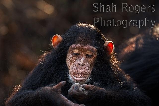 Eastern chimpanzee infant male 'Ipo' aged 5 years feeding on charcoal from a fire (Pan troglodytes schweinfurtheii). Gombe National Park, Tanzania. September 2014.