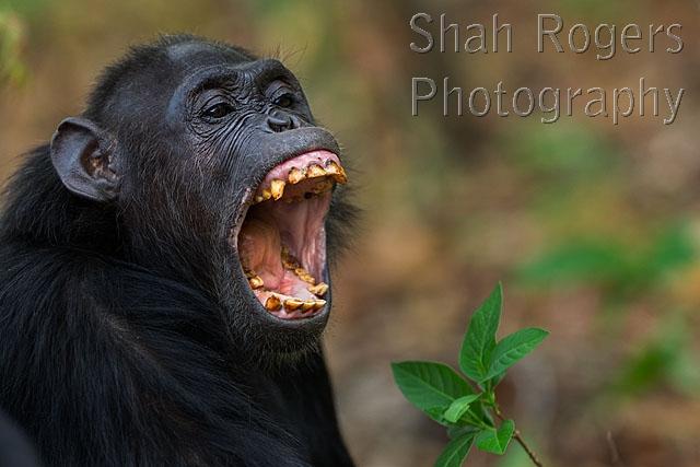 Eastern chimpanzee female 'Fanni' aged 33 years yawning (Pan troglodytes schweinfurtheii). Gombe National Park, Tanzania. September 2014.