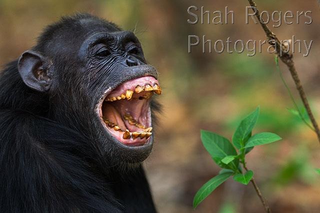 Eastern chimpanzee female 'Fanni' aged 33 years yawning (Pan troglodytes schweinfurtheii). Gombe National Park, Tanzania. September 2014.