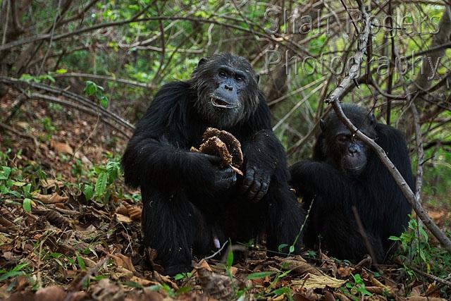Eastern chimpanzee alpha male 'Ferdinand' aged 22 years feeding on the honeycomb from a bees nest watched by his brother 'Faustino' aged 25 years (Pan troglodytes schweinfurtheii). Gombe National Park, Tanzania. September 2014.