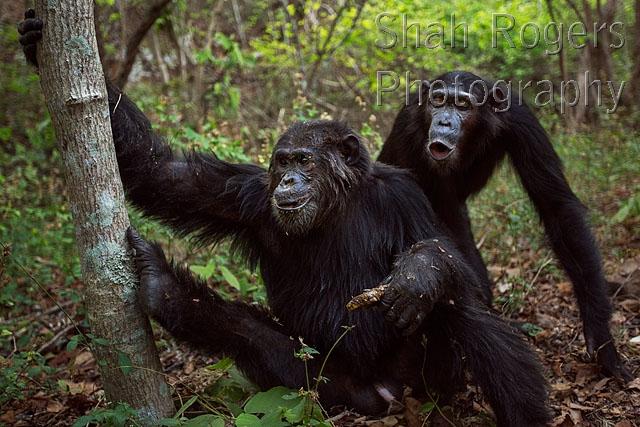 Eastern chimpanzee alpha male 'Ferdinand' aged 22 years feeding on the honeycomb from a bees nest while female 'Samwise' aged 12 begs for some (Pan troglodytes schweinfurtheii). Gombe National Park, Tanzania. September 2014.