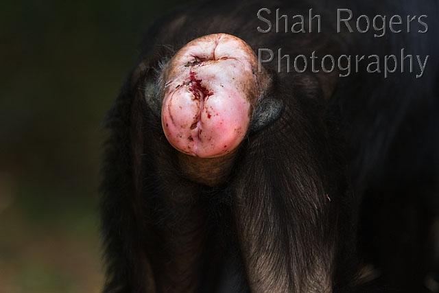 Eastern chimpanzee female 'Samwise' aged 12 years - estrus swelling (Pan troglodytes schweinfurtheii). Gombe National Park, Tanzania. September 2014.