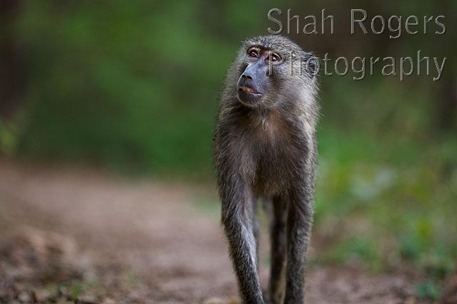 Olive baboon juvenile walking along a track (Papio anubis). Gombe National Park, Tanzania. September 2014.