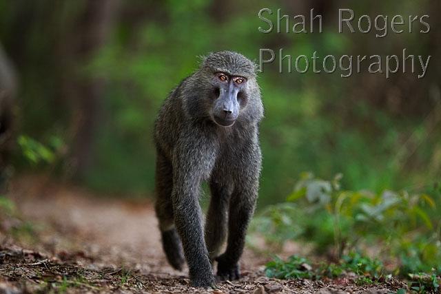 Olive baboon female walking along a track (Papio anubis). Gombe National Park, Tanzania. September 2014.