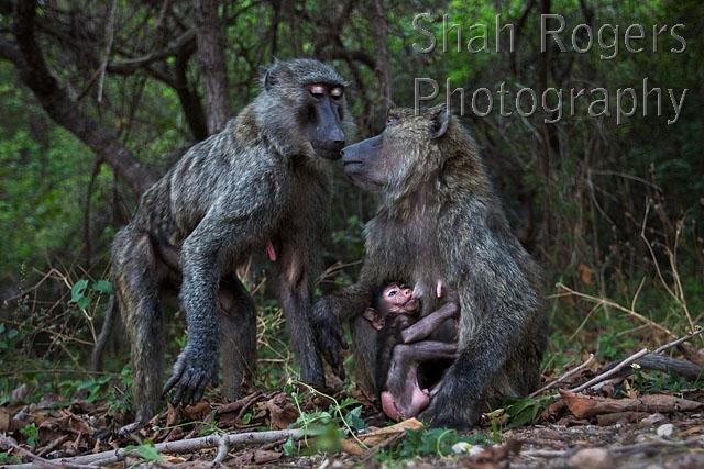 Olive baboon female with her baby aged about 3 months watched by another female (Papio anubis). Gombe National Park, Tanzania. September 2014.