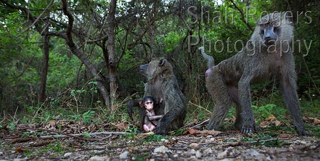 Olive baboon female with her baby aged about 3 months watched by another female making a submissive gesture (Papio anubis). Gombe National Park, Tanzania. September 2014.