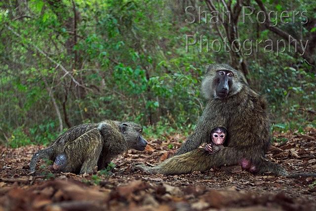 Olive baboon females and baby aged about 3 months sitting on the forest floor(Papio anubis). Gombe National Park, Tanzania. September 2014.