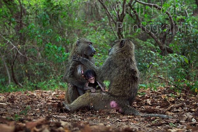 Olive baboon females and baby aged about 3 months sitting on the forest floor(Papio anubis). Gombe National Park, Tanzania. September 2014.